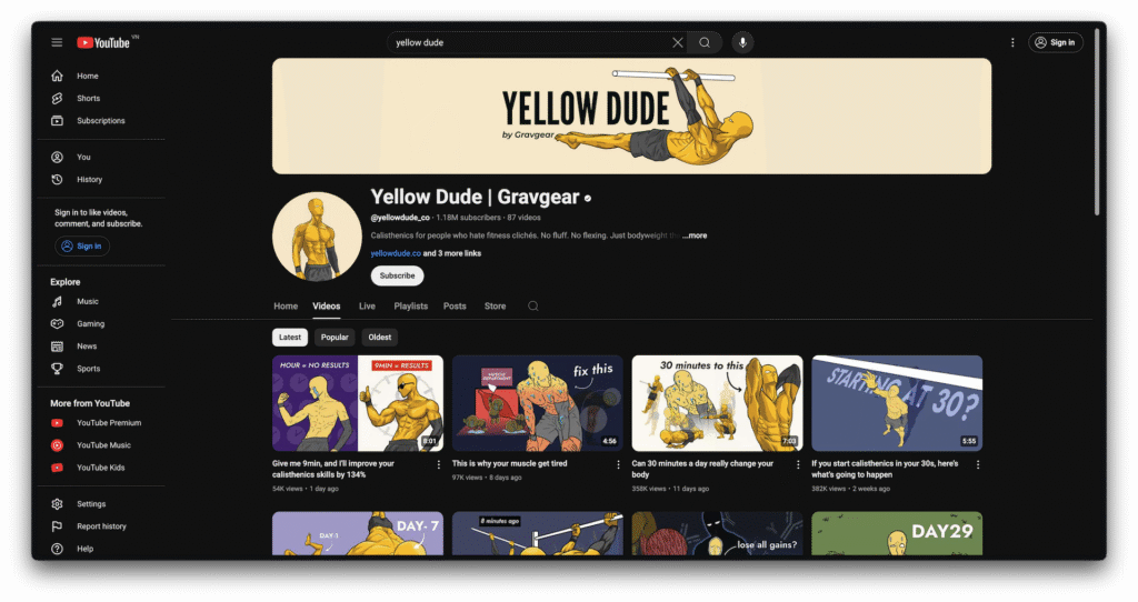 “Chào mừng đến Gravity Strength! Yellow Dude mang tới các calisthenics workouts tập tại nhà không cần dụng cụ. Tập trung bodyweight training hiệu quả, đi thẳng vào vấn đề: push workout levels, chest workouts, full-body… Tinh gọn – dễ theo – lên form thực tế. Theo dõi kênh để nhận video home workout mới mỗi tuần và bắt đầu hành trình calisthenics của bạn!”